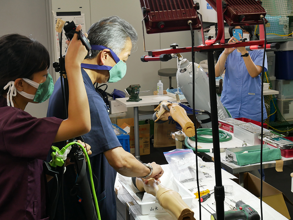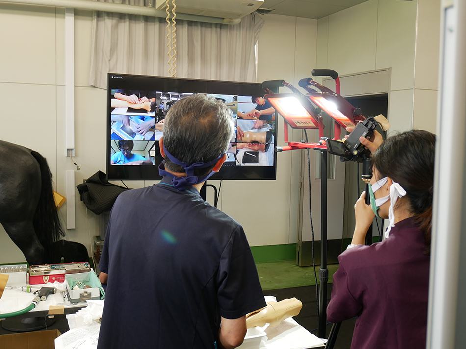 昨年度は受講者が大学に来て、対面で実習を行いましたが、今年度は新型コロナウイルス感染症対策として遠隔で実施をしました。受講者にあらかじめ模型等の実習キットを送付し、受講者は自宅からPC等で講師の実演を見て、指導を受けながら馬の脚の骨折処置などの実習を、模型を使って行いました。