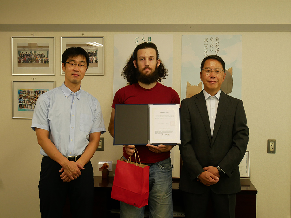 令和元年10月1日から令和2年8月31日まで,本学部で受け入れを行ったスペイン・サラゴサ大学からの交換留学生MARTINEZ AZNAR PEDRO GABRIEL さんの修了式を学部長室にて行いました。
