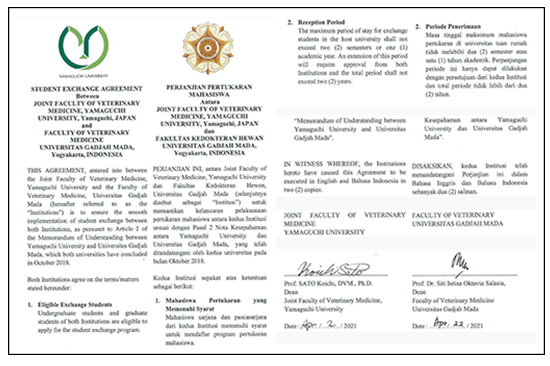 ガジャマダ大学は、インドネシアのジョグジャカルタ特別州に位置し、18学部、5万6千人の学生を有するインドネシア最大級の総合大学であるとともに、インドネシア国内大学ランキングで1位を獲得している名門大学でもあります。山口大学とは2008年に大学間国際交流協定を締結し、これまで活発な研究者交流を行ってきました。特に、共同獣医学部とは,文部科学省の「インドネシアにおける国際的獣医学教育研究者育成プログラムの構築」事業において,インドネシアにおける獣医学教育研究者育成プログラムを構築し,アジアにおける獣医学教育プログラムの標準化を目指す取組や同大学の若手研究者を本学に招聘して育成プログラムを実施してきました。今回、これまでの取組を学生交流に展開するために「学生交流に関する附属書(SEA)」を締結しました。今後は、交換留学等により双方の学生を交流させることで、本学部の国際化及び獣医学教育のさらなる発展を進めていきます。
