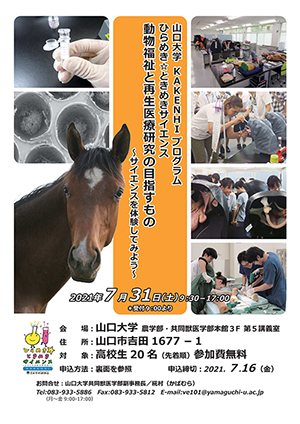 令和3年7月31日(土)に、共同獣医学部において、ひらめき☆ときめきサイエンス「動物福祉と再生医療研究の目指すもの~サイエンスを体験してみよう~」を開催いたします。