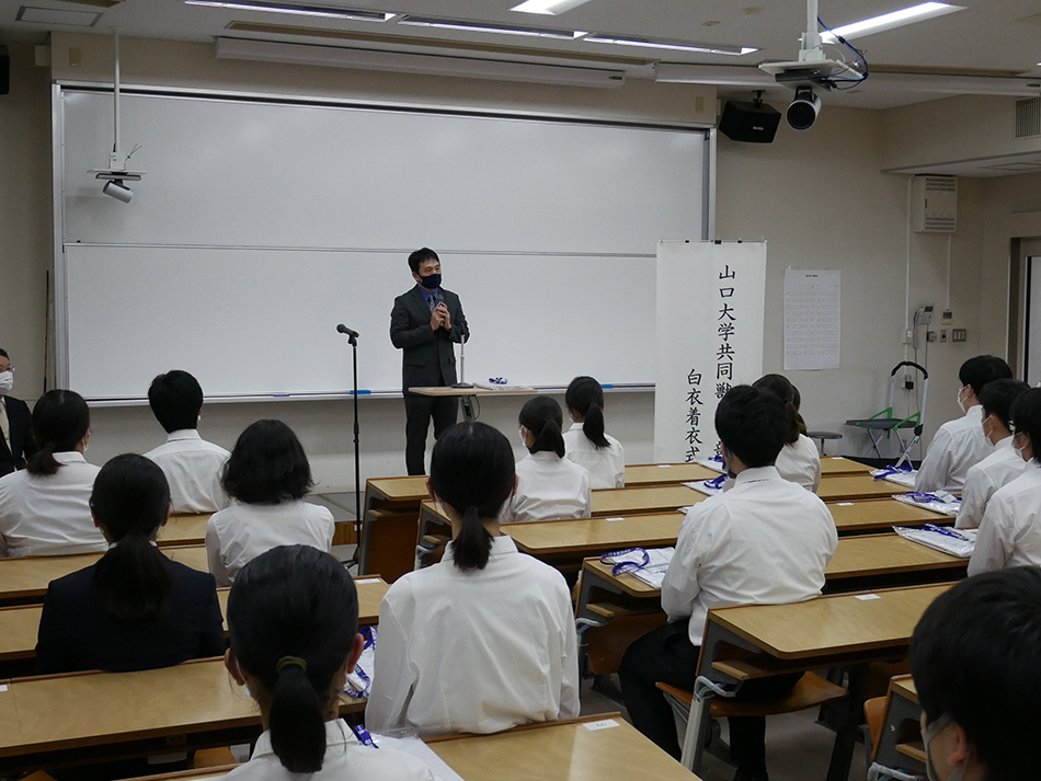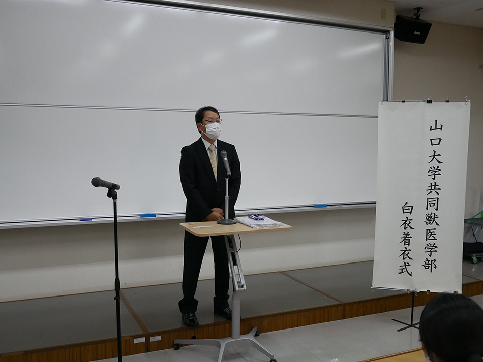 式では,佐藤 晃一学部長並びに谷 健二動物医療センター長より,「本日の式典を一つの区切りとして,これから獣医師になるための自覚,責任感を持って,臨床実習を通して,動物や飼い主の方に寄り添い,様々な現場での対応を学んで行ってほしい」など,お祝いと共に,激励の言葉が述べられました。 その後,学生代表の中原千尋さんが学生授与代表として,Student Doctor認定証と共同獣医学部(VetJapan South)ロゴ入り白衣を授与されました。