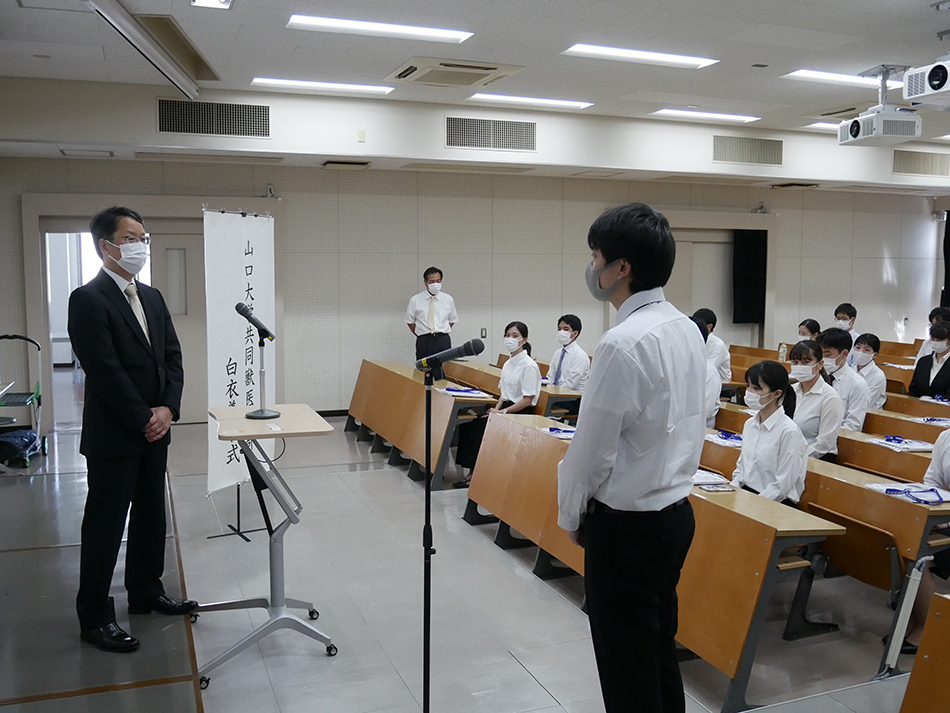 引き続き,学生代表の柳田健斗さんから,「小動物臨床から公衆衛生分野まで,幅広い知識を有する獣医師となることが求められており,社会の期待に応えられるよう,獣医学生としての自覚,責任感や使命感をもって,真摯に実習に取り組みたい。これまで学んだきた知識を活かし,先生方の期待に添えるよう頑張りたい。」と宣誓されました。