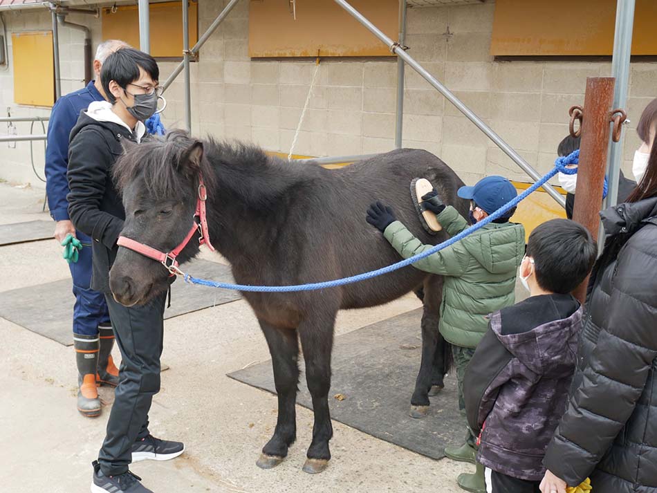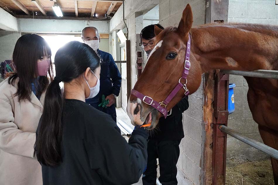 「ホースヒーリングサークル」の学生が最初に注意事項を説明した後、厩舎へ移動し、佐々木教授や学生のサポートのもと、持参したニンジン・リンゴをの餌やり、ブラッシングをしました。