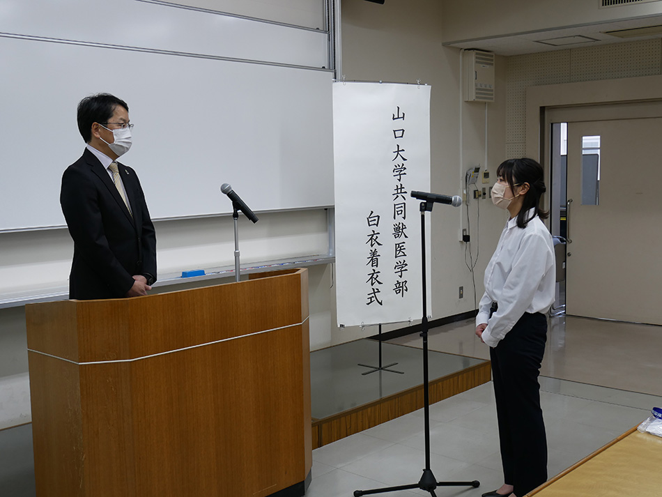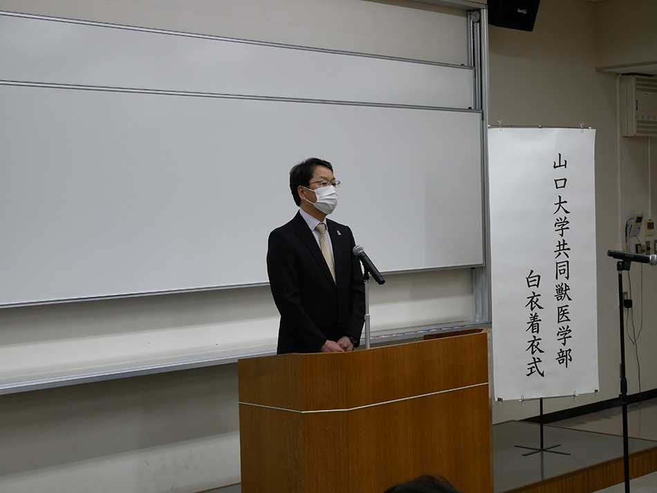 式では,佐藤 晃一学部長並びに谷 健二動物医療センター長より,「無事にStudent Doctorになってくれた事を感慨深く思う。これからの2年間がとても大事なものとなる。本日の式典を一つの区切りとして,これから獣医師になるための自覚,責任感を持って,臨床実習を通して,動物や飼い主の方に寄り添い,様々な現場での対応をしっかり学んで行ってほしい」など,お祝いと共に,激励の言葉が述べられました。