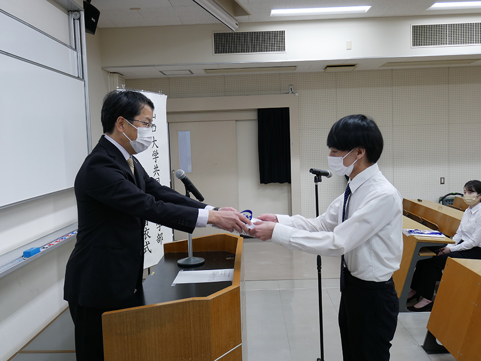 その後,学生代表の刀根朋史さんが学生授与代表として,Student Doctor認定書と共同獣医学部(VetJapan South)ロゴ入り白衣を授与されました。