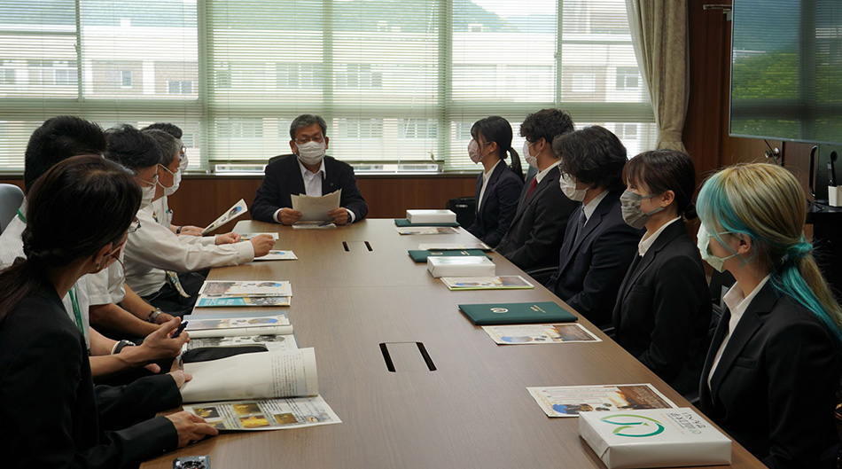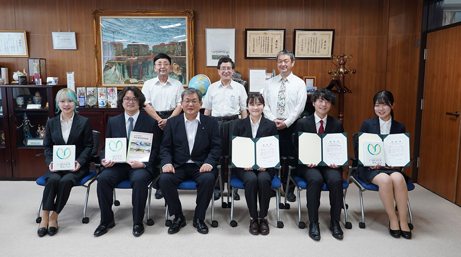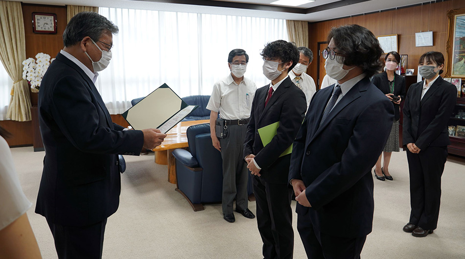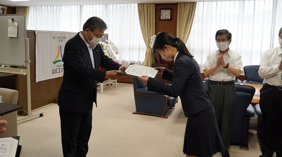 おもしろプロジェクト’21の学長賞に、共同獣医学研究科3年(活動時2年)の松屋純人さんが代表の「山口大学に生息する野生哺乳動物の多様性調査」と、共同獣医学部6年(活動時5年)の藤原優美さんが代表の「みんなでハッピーホースライフ!」が選ばれ、6月20日の授賞式で谷澤学長から賞状及び副賞の授与が行われました。