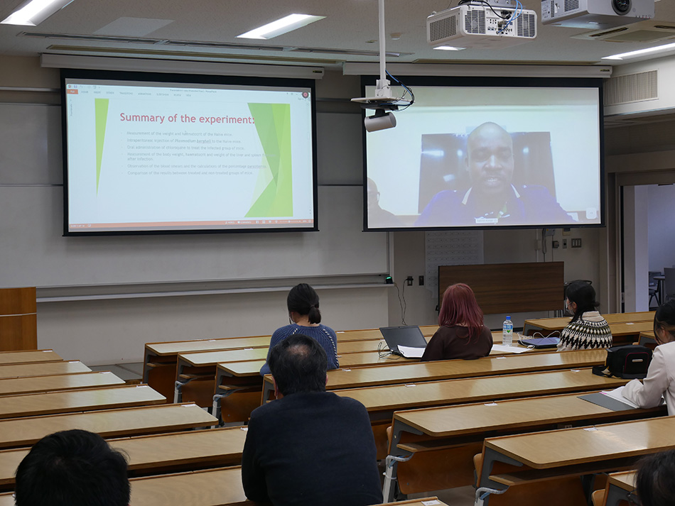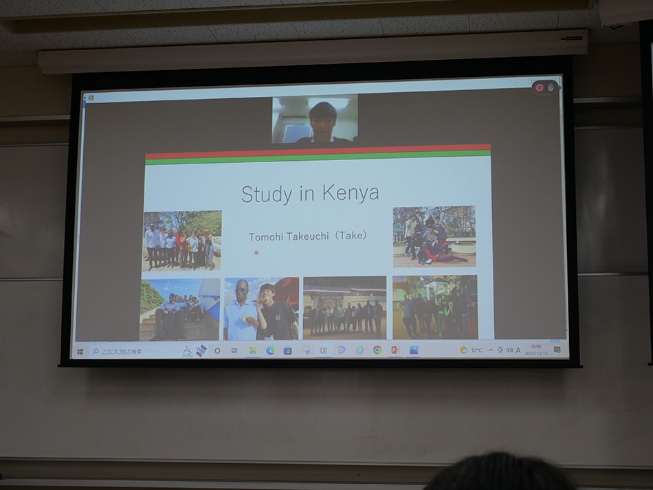 本学が2020(令和2)年度に採択された「大学の世界展開力強化事業」~アフリカ諸国との大学間交流形成支援~におけるプログラムにて今年度ナイロビ大学へ派遣した山口大学共同獣医学部生4名と山口大学に派遣されたナイロビ大学獣医学部生8名による報告会が2022(令和4)年12月13日(火)に対面とオンライン会議システムを使用するハイブリッド型で開催されました。