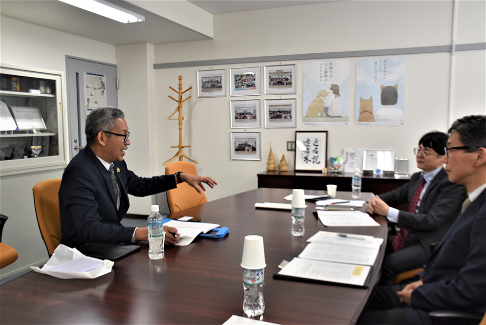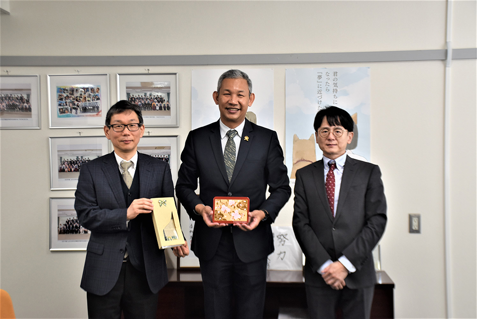 表敬訪問には、本学から度会学部長、加納学務委員長が出席し、今後の学生交流や共同研究を視野に入れた教員の交流等について懇談が行われました。