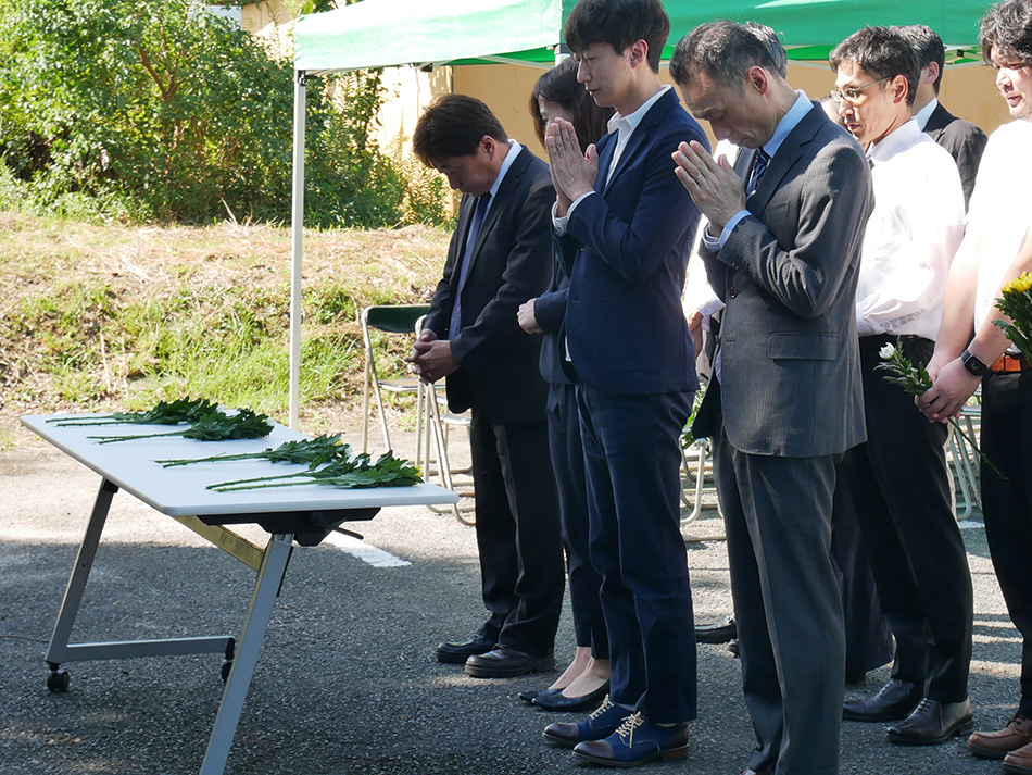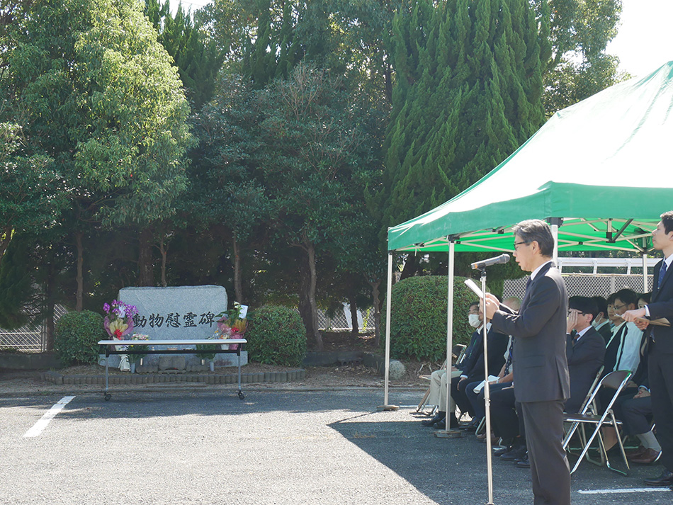 はじめに度会学部長から「私達の日頃の教育、研究、診療活動には、ここに納められている動物達の献身的な協力があったことに深く感謝し、今後も教育・研究・診療により一層励むことを誓います」との挨拶があり、続いて学生代表が慰霊の言葉を述べたあと、参列者全員による献花が行われました。その後、中市動物医療センター長の挨拶、最後に山口県獣医師会の田中会長から参列者代表としての挨拶をいただきました。
