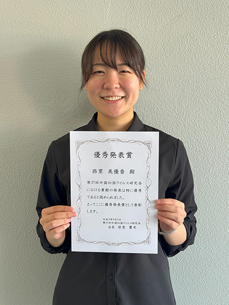 共同獣医学部5年西里美優香さんが、2023年9月2日から9月3日にかけて岡山大学津島キャンパスで開催された第37回中国四国ウイルス研究会において、優秀発表賞を受賞しました。