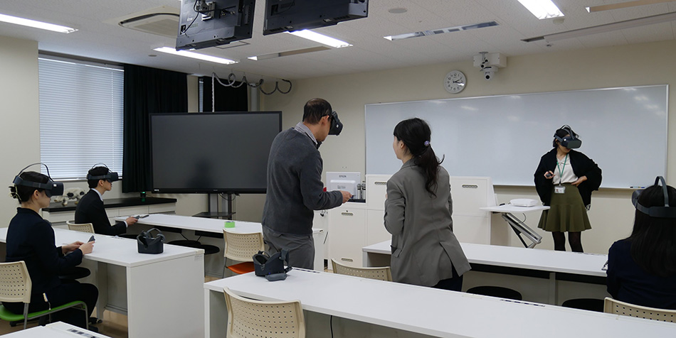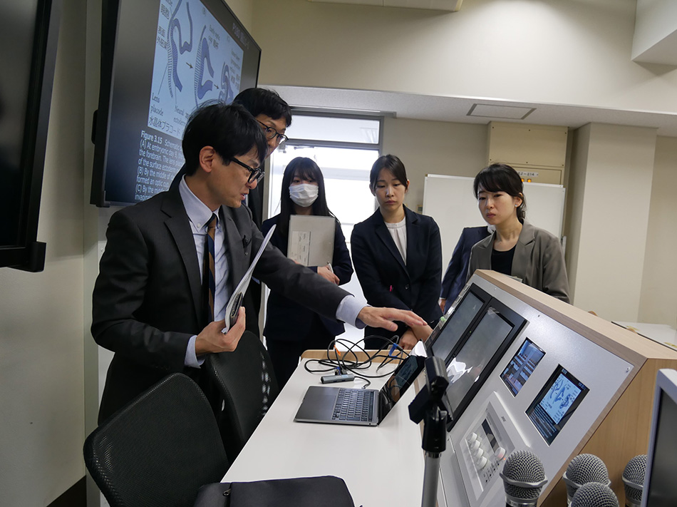 視察・見学では、本館及び獣医学研究科棟の遠隔講義システムや自習室(クリニカル・スキルスラボ、図書室)、iCOVER内の実習室(高度感染症実習室:BSL-3対応)、さらには、2科目(獣医微生物学実習A、産業動物診断治療学実習)の授業に加え、VR教材も体験されました。