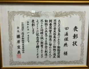 また、令和6年1月26日には、山口県動物保護管理協会から記念品と共に表彰状を贈呈されました。
