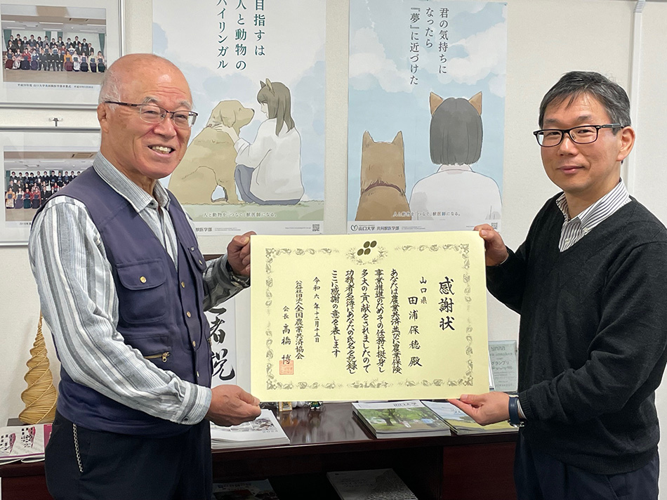 令和6年12月13日、田浦保穂教授(特命)が全国農業共済協会から感謝状を贈呈されました。
