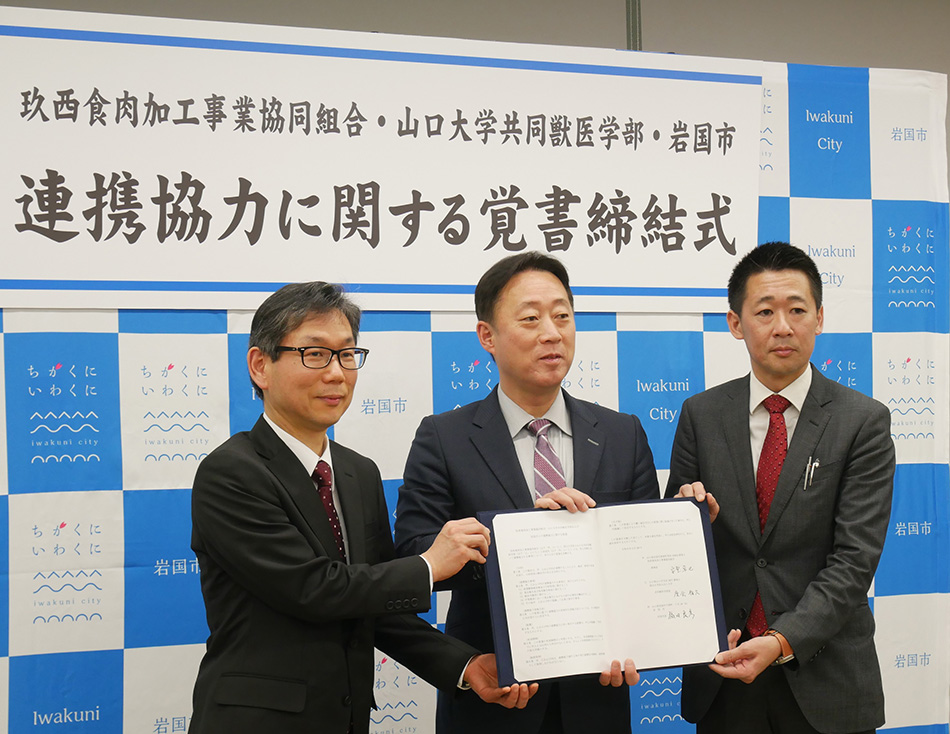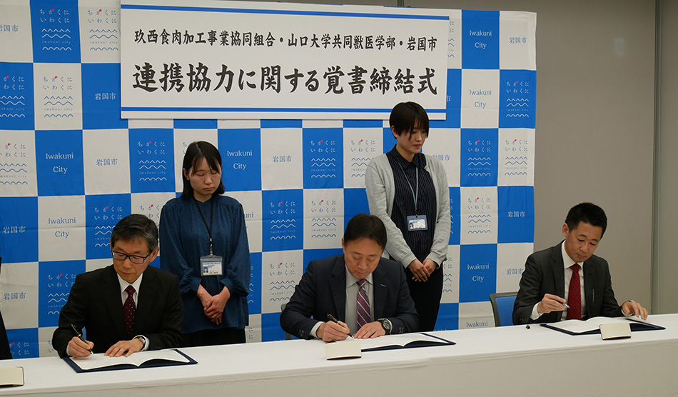 令和6年3月29日(金)に,本学部,岩国市及び玖西食肉加工事業協同組合の三者で連携協力に関する覚書を締結しました。