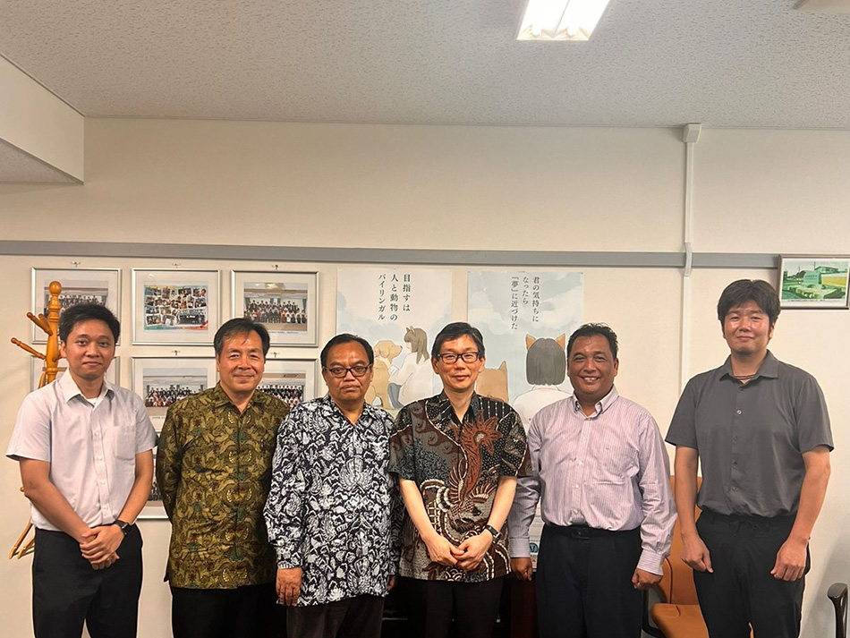令和6(2024)年7月16日(火)〜18日(木)の日程で、インドネシア・ガジャマダ大学獣医学部・Teguh Budipitojo学部長とAgung Budiyanto副学部長が来学されました。石井由理 国際連携担当副学長、佐藤晃一 研究推進担当副学長を表敬訪問し、度会雅久共同獣医学部長らとともに、これまでの山口大学との交流や今後の両大学間の交流について懇談されました(写真1)。