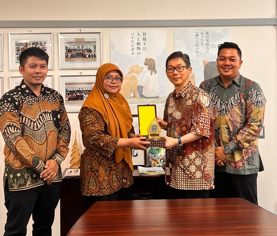 2024年7月29日(月)、インドネシア特別州・グヌンキドゥル県から来学した3名のJICA研修員が度会雅久学部長を表敬訪問しました。本学部とガジャマダ大学獣医学部が連携してグヌンキドゥル県で展開するJICA草の根事業「ジョグジャカルタにおける農業従事者の生活向上のための牛繁殖効率の改善(支援型)」の一環として7月25日に来学し、8月9日(金)まで国内研修を受けます。谷口雅康准教授を中心とした過去2年間の現地活動では、今回来学したNanik獣医師、Adhit獣医師、Pradipta人工授精師と大きな信頼関係を築いてきました。来日後10日間は検疫期間として屋内研修を受け、8月5日から県内の畜産農家で実地研修が行われます。