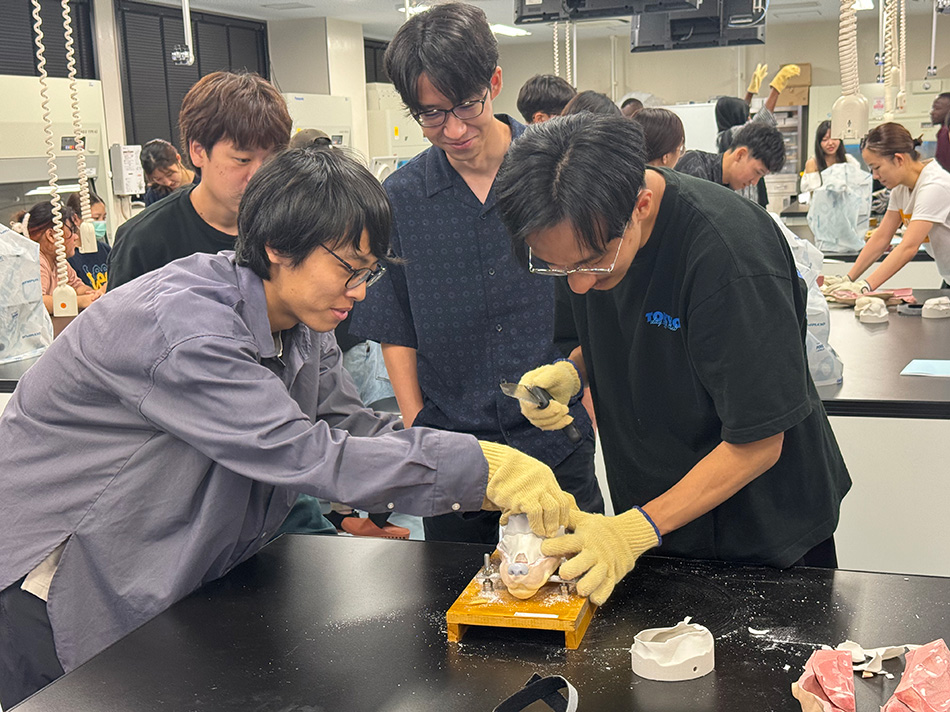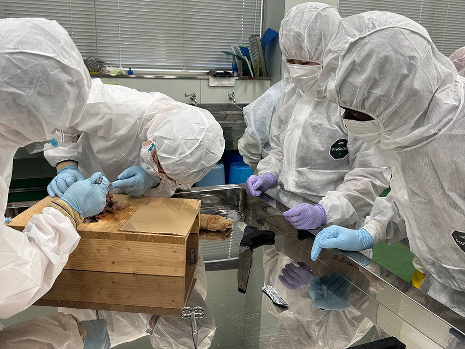 本実習は、高病原性微生物の生態、病原機構、検出法および感染予防に関する診断・調査を推進するために必要な高度専門知識を習得することを目的として行うもので、バイオセーフティーレベル(BSL)-2およびBSL-3実験室において、病原微生物を用いた実践的な実習の他、狂犬病や炭疽発生時に対応可能な人材の育成を目的とした診断方法を学ぶ実践実習、高度感染症実習室(BSL3対応)、総合病性鑑定施設(iPADL)を用いた実習などを行いました。本実習では、期間中に複数回防護服を着脱する機会を設けている他、微生物を安全に取り扱う上で必須である安全キャビネット操作を全ての学生がマスターできるよう指導するなど、学生が高病原性微生物の取扱い方法、診断法を総合的に学ぶことができます。新型コロナウイルス感染症の流行により、動物由来感染症の制御に関わる獣医師の役割が再認識されていますが、本実習により病原体の取り扱い技術を持ち、卒業後には即戦力として地域に貢献できる人材を育成していきたいと考えています。