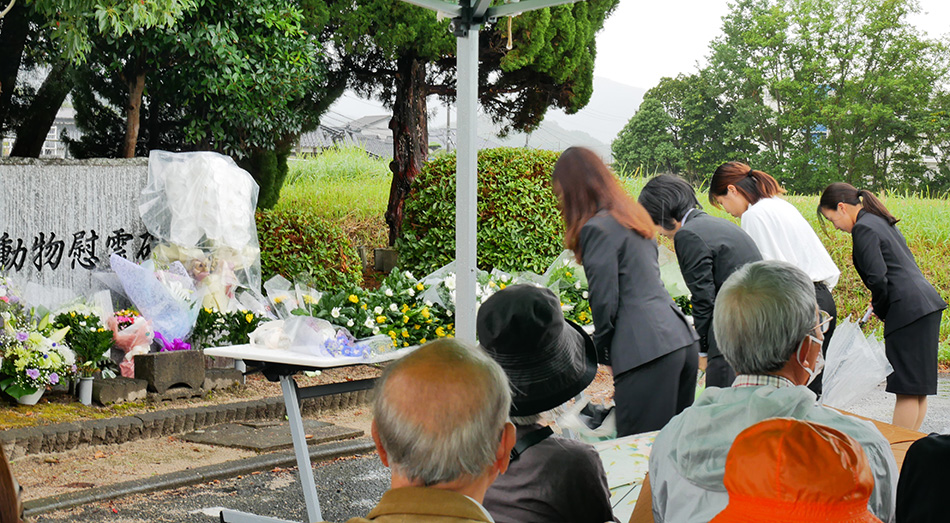 10月2日(水)、雨が降りしきる中、動物医療センター敷地内の動物慰霊碑前広場において、飼い主であった方々、教員、学生、山口県獣医師会長が参列し、動物慰霊祭が執り行われました。
