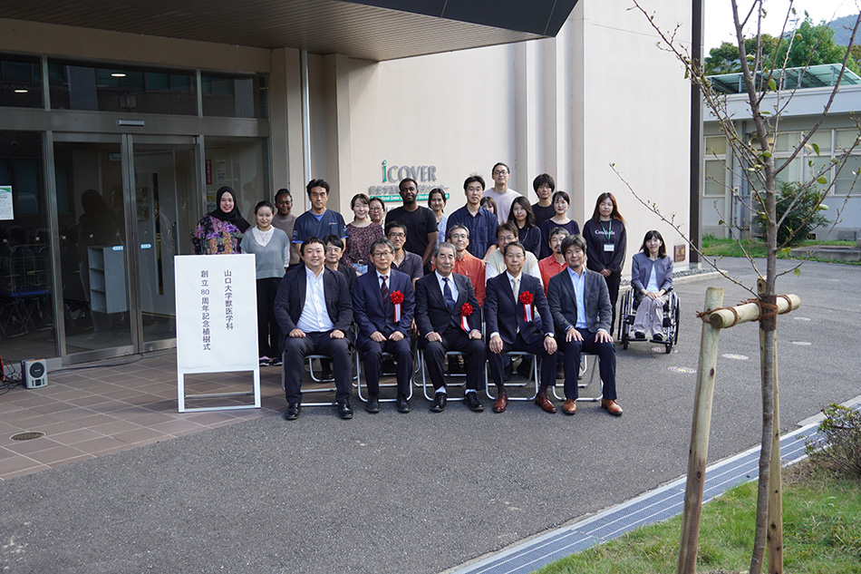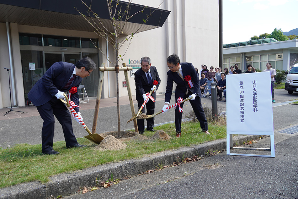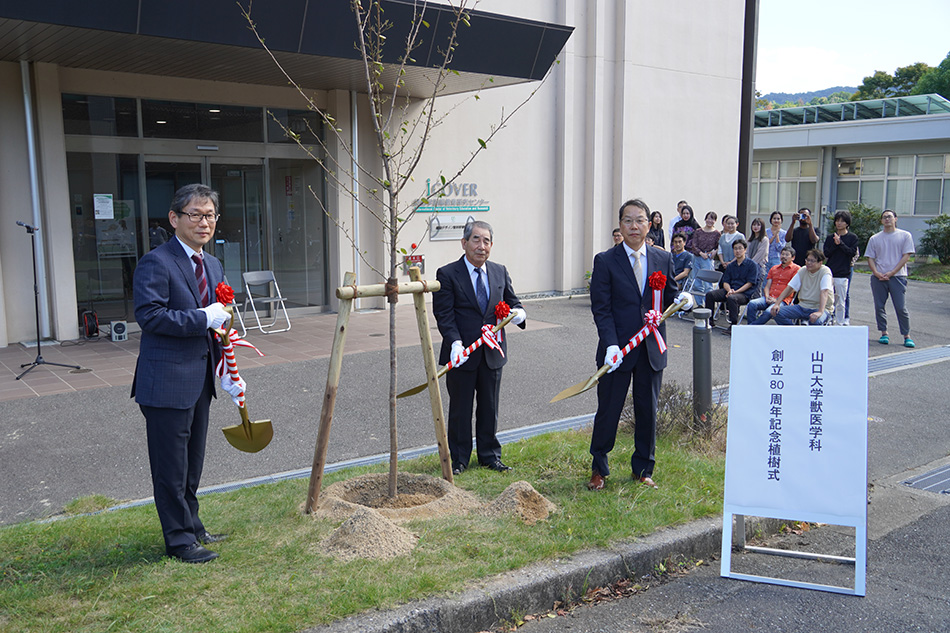 令和6年10月10日(木)、爽やかな秋晴れのもと、山口大学獣医学科創立80周年を記念して、獣医学国際教育研究センター(iCOVER)前において記念植樹式を行いました。