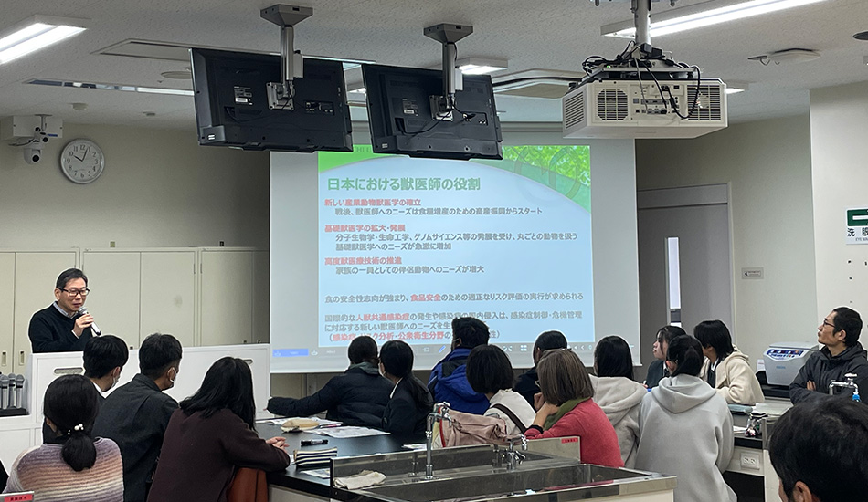 このイベントは,令和6年3月29日に,本学部,岩国市及び玖西食肉加工事業協同組合の三者で締結した連携協力に関する覚書に基づき,岩国市内の中高生に対して,将来の選択肢のひとつとしての獣医師,畜産業への理解・興味の醸成のため開催したものです。