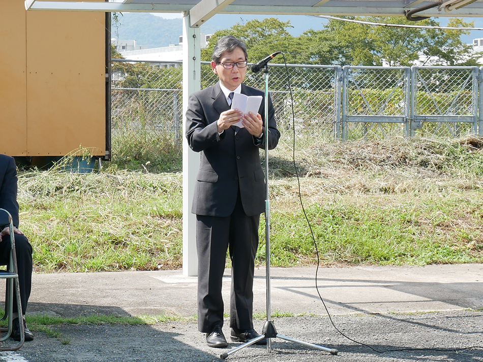 はじめに度会学部長から「私達の日頃の教育、研究、診療活動には、ここに納められている動物達の献身的な協力があったことに深く感謝し、今後も教育・研究・診療により一層励むことを誓います」との挨拶があり、続いて学生代表が慰霊の言葉を述べたあと、参列者全員による献花が行われました。その後、中市動物医療センター長の挨拶、最後に山口県獣医師会の中村会長から参列者代表としての挨拶をいただきました。