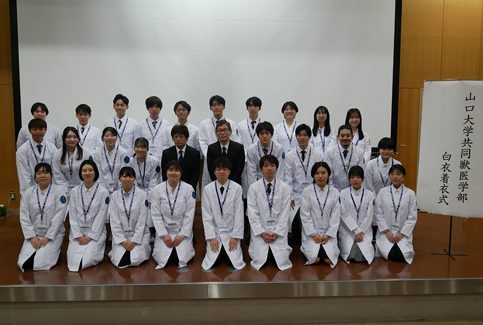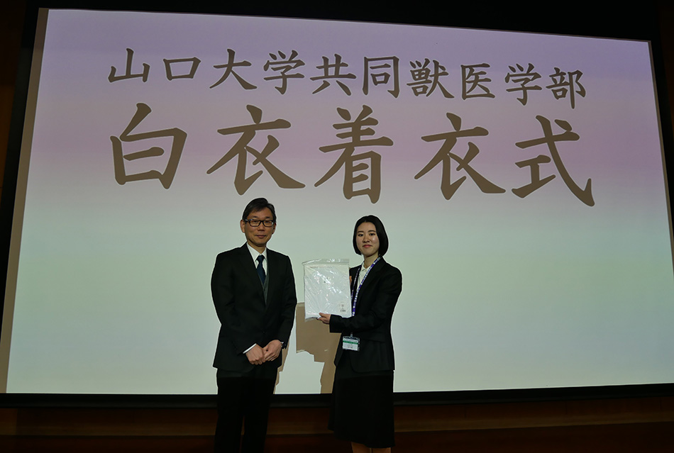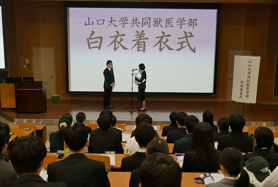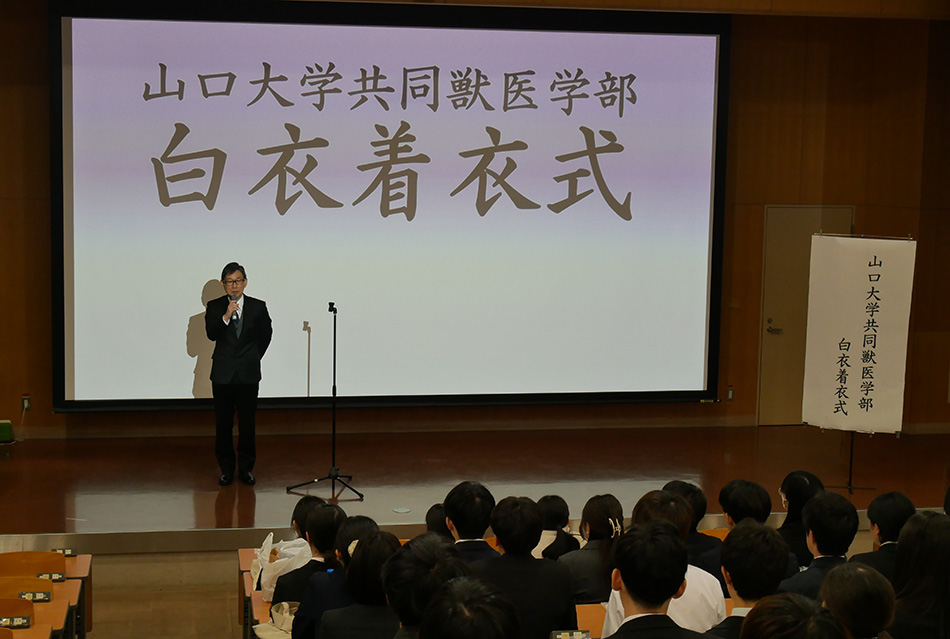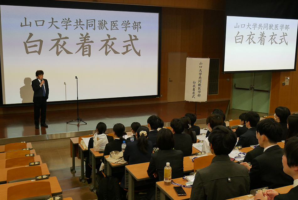 式では、度会雅久学部長並びに中市統三動物医療センター長より、「今からStudent Doctorとして、学外での実習が多くなるが、山口大学生として、これから獣医師になるための自覚、責任感を持って、臨床実習を通して、動物や飼い主の方に寄り添い、一致協力して頑張ってほしい」など、お祝いと共に、激励の言葉が述べられました。