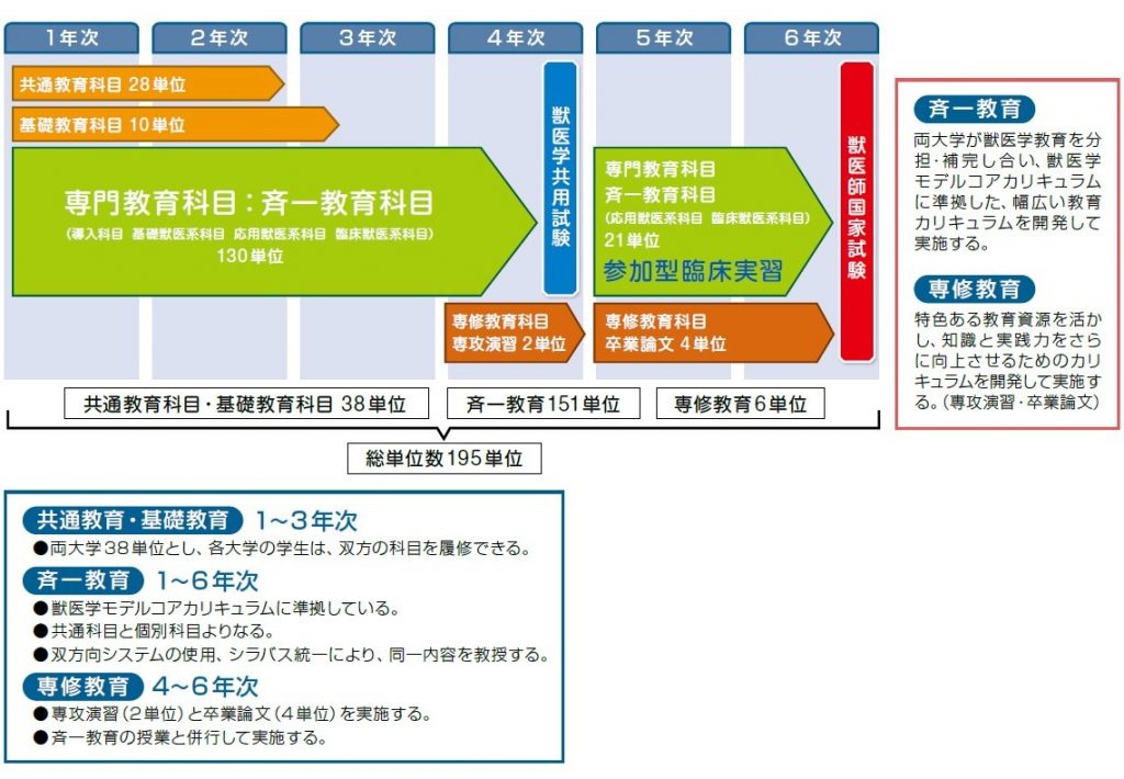 - 専門教育の核となる「斉一教育科目」を履修し、獣医師として必要な知識と技能を身につけます。斉一教育科目は、動物の構造と機能に関する「基礎獣医系科目」、病原体及び病態基礎並びに動物疾病の診断予防に関する「応用獣医系科目」、動物疾病の診断治療に関する「臨床獣医系科目」から構成されます。臨床獣医系科目の参加型実習では、学内外施設における動物症例を通して、学生に診療実習指導を行います。