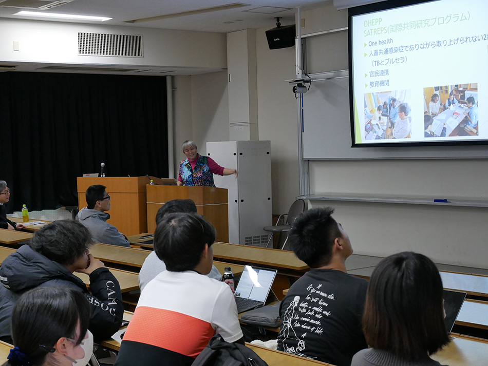 SATREPS プロジェクト「ワンヘルス・教育・官民連携による顧みられない人獣共通感染症介入の共同デザインに関する研究開発(OHEPP-SATREPS)」(代表:蒔田浩平・酪農学園大学教授)とのコラボ企画セミナーが、山口大学吉田キャンパス獣医学研究科棟にて開催されました。 講師にSATREPS タンザニア業務調整員の大木奈美先生をお招きし、「アフリカで獣医師をするということ」をテーマに、現場の最前線でご活躍されている大木先生ならではの貴重なお話を伺うことができました。会場には大学、一般市民の方から54名の参加がありました。講演後の質疑応答においても活発な意見交換があり、大変有意義な学術交流の場となりました。