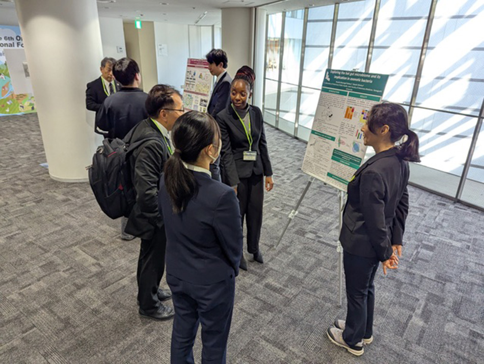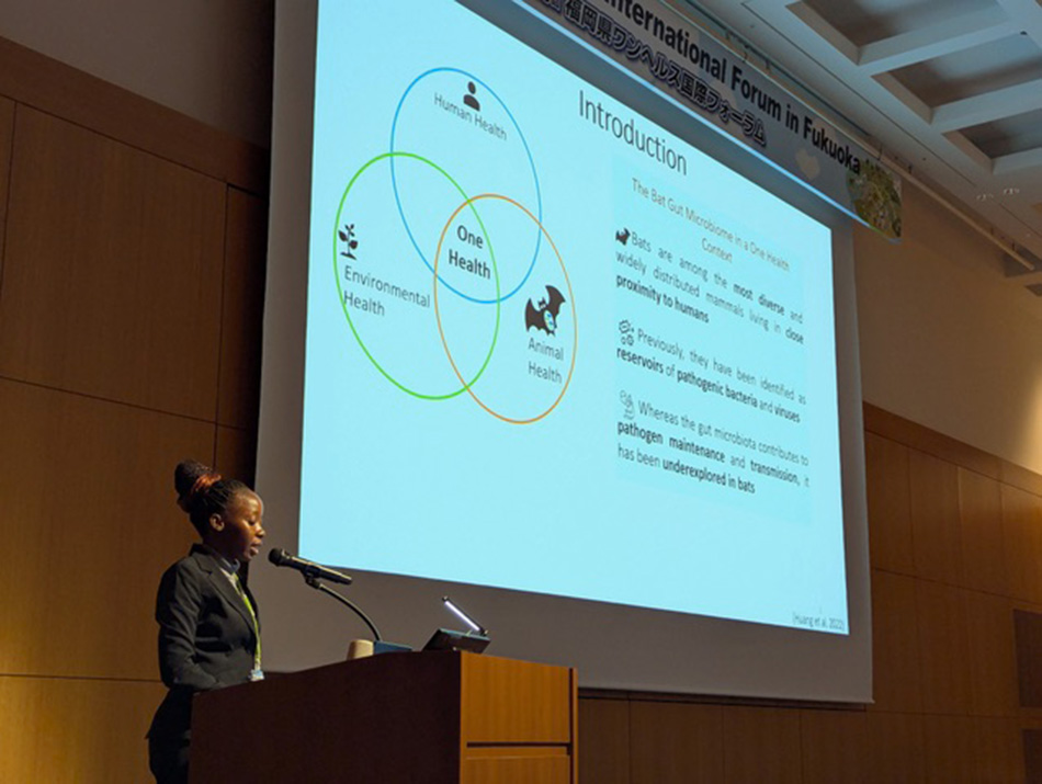 第6回福岡県ワンヘルス国際フォーラムにおいて当研究科のRosalia Mwongeli Makauさんが「Exploring the bat gut microbiome and its implication in zoonotic bacteria」というタイトルで口頭発表およびポスター発表を行いました。国内外の参加者と積極的に交流、ディスカションを行い、実り多い研究発表となりました。