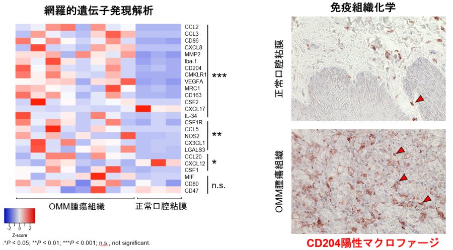 免疫組織化学では、OMM組織において、TAM(矢頭)が高頻度に浸潤していた。