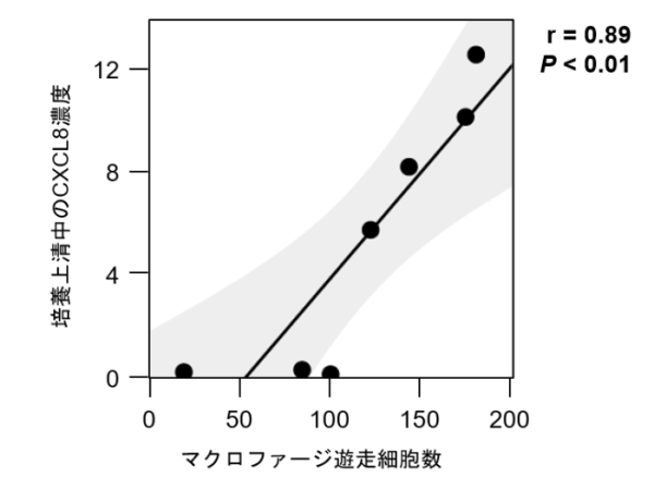 さらに、その走化性因子の同定のために、各種ケモカインの遺伝子発現量とマクロファージの走化性の比較を行ったところ、好中球の走化性因子として知られるCXCL8が候補として浮上し、培養上清中のCXCL8濃度とマクロファージの遊走数に強い相関が認められました(図2)。