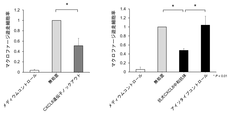 図3 : CXCL8遺伝子ノックアウトや、抗犬CXCL8中和抗体を添加したところ、マクロファージの走化性が抑制された。