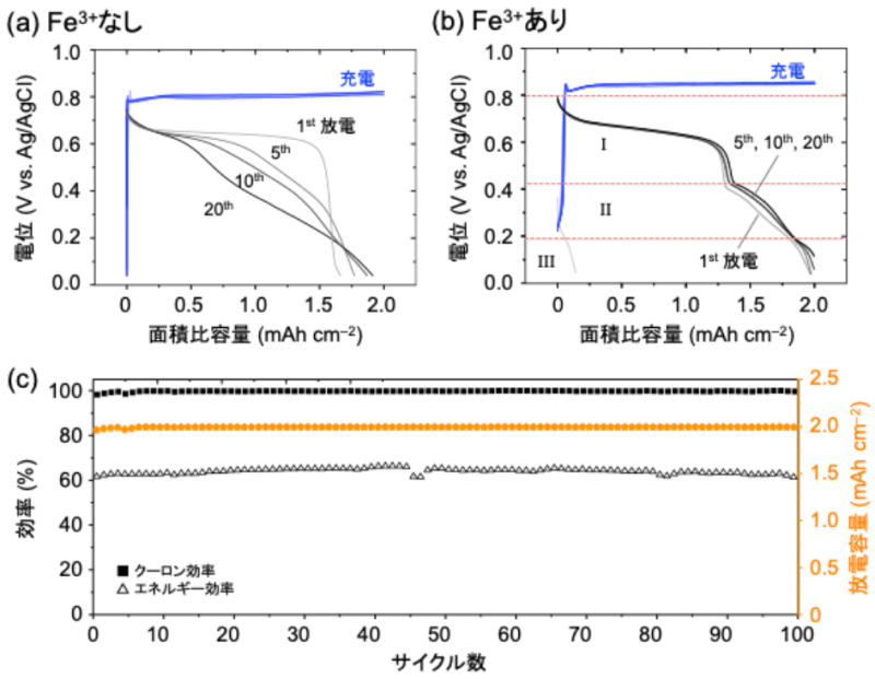 図1.Fe3+非存在下(a)および存在下(b)での定電流充放電曲線と100サイクル中のクーロン効率、エネルギー効率、面積基準の放電容量のプロット(c).