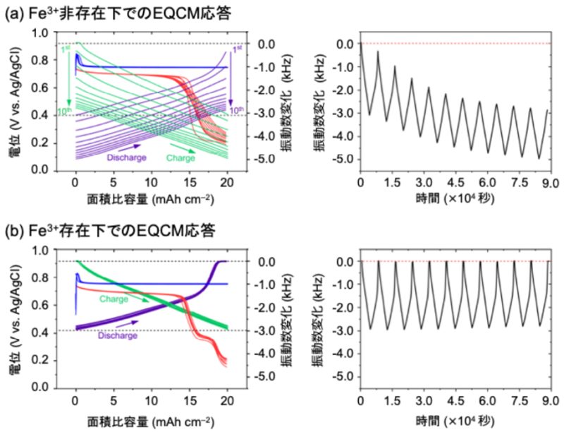 - 電気化学水晶振動子マイクロバランス(EQCM) ※用語6により、Fe3+が存在する場合、充放電過程での質量変化が完全可逆であることを実証(図2)。