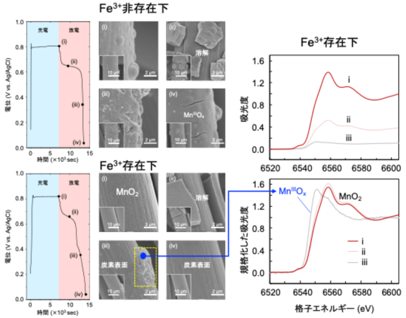 図3.Fe3+非存在下での放電過程においてポイント(i)〜(iii)で停止したときのカーボン表面のSEM像とX線吸収スペルクトル(上図はサンプル質量で、下図は6558.6 eVの強度で規格化).