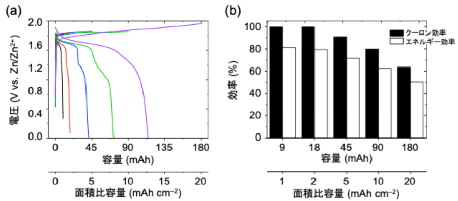- 集電体にカーボンフェルトを採用し、Zn2+およびMn2+を含む電解液に、バッファーとFe3+を添加することで可逆性と高い面積比容量を実現