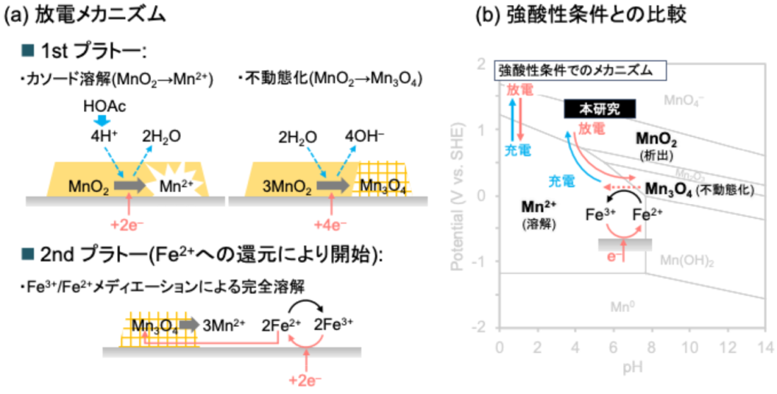 - 弱酸性条件を基盤とし、バッファーとFe3+レドックスメディエーター※用語5を導入することで、MnO2の析出/溶解を2電子反応でありながら完全可逆にすることに成功(図1)。