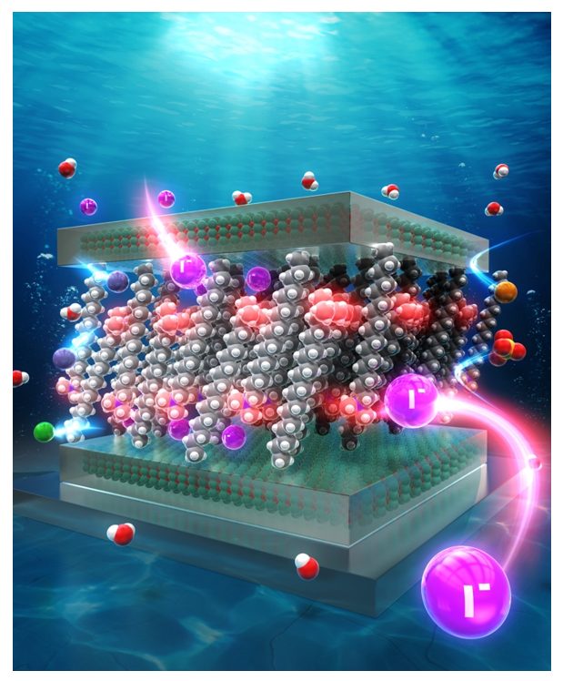山口大学大学院創成科学研究科の吉田 航助教らの研究グループは、海水など、高濃度の塩水に含まれる微量のヨウ化物イオン(I–)を高効率かつ高選択的に回収できる新材料「CTAC/MnO2薄膜」の開発に成功しました。海水中のI–濃度はわずか約0.1 mg L–1と極めて低く、さらに多量に共存する塩化物イオン(Cl–)や、硫酸イオン(SO42–)などのイオンが競合するため、従来技術では高い選択性と回収効率を両立することが困難でした。