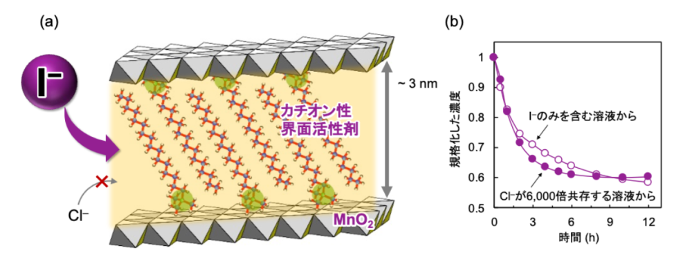 - 積層二酸化マンガン(MnO2)※用語3の層間にカチオン性の界面活性剤であるセチルトリメチルアンモニウムクロリド(CTAC)※用語4を配向させることで疎水性ナノ空間※用語5を形成し、6000倍のCl–が共存する環境でもI–を選択的に吸着した(図1)。