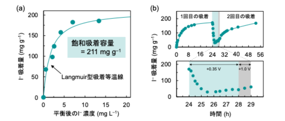- 吸着されたヨウ化物イオンは電圧の印加により脱離できるため、材料の繰り返し使用(再生)が可能