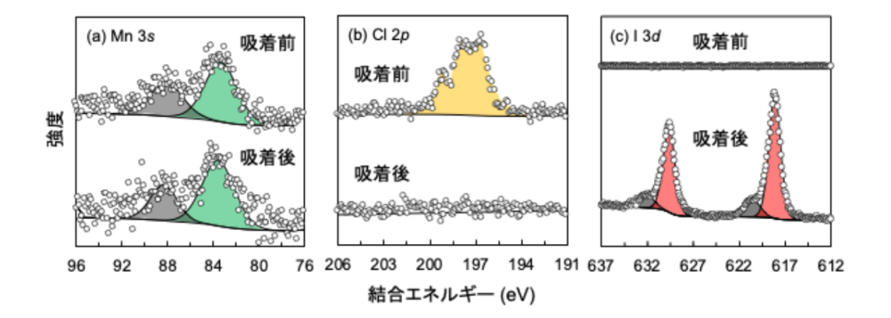 図3.X線光電子分光法スペクトル.I–吸着前後でマンガン(a)の価数変化は起きていない。一方、吸着前に層間に存在したCl–由来のピーク(b)は吸着後に消失しており、代わりにI–由来のピーク(c)が観測された.