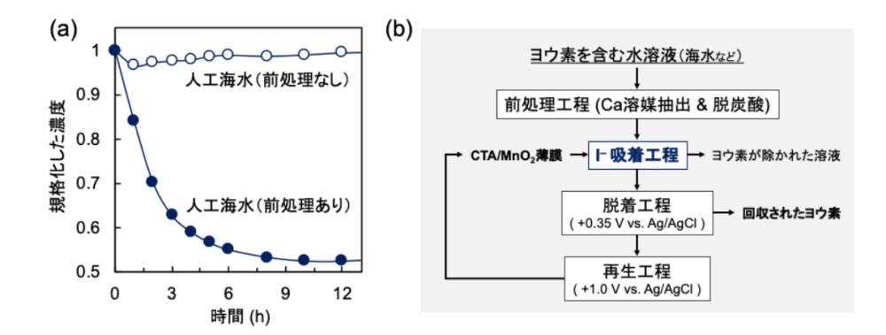 図4. (a) 人工海水からのI–吸着.前処理を行うことで良好なI–吸着挙動を示す.(b) 開発したCTAC/MnO2薄膜を用いたヨウ素回収のフローシート