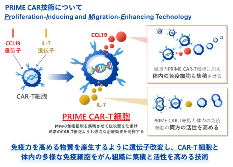 玉田教授らの研究チームは、難治性の固形がんに対して高い治療効果を発揮しうる次世代CAR-T細胞である「PRIME CAR-T細胞」を独自に創生し、その実用化に向けた研究開発を進めています。PRIME CAR-T細胞とは、CARに加えて、さらに免疫反応を高める物質であるCCL19ケモカインとIL-7サイトカインを産生するように遺伝子改変されたT細胞で、通常のCAR-T細胞としての働きに加えて、患者さんの体内に存在する様々な免疫細胞をがんの部分に集結させ、増殖させることを可能とした技術です(図1)。これまでに、複数の動物モデルや初期の臨床試験において、PRIME CAR-T細胞の固形がんに対する治療効果を示唆するデータが得られています。