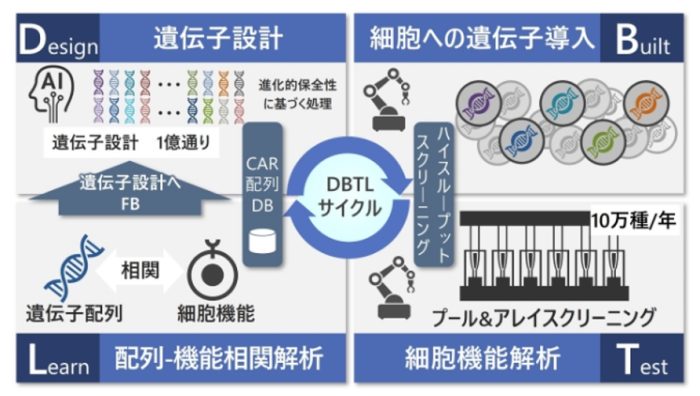 日立製作所は、独自の遺伝子配列生成AIを用いて1億通りの組み合わせに及ぶ新たなCAR遺伝子配列を効率的にデザインする技術を有しています。また、単一細胞レベルでCAR-T細胞を評価可能なプールスクリーニング技術と、ロボット操作により細胞への遺伝子導入から細胞の機能解析までの一連の工程を自動化したアレイスクリーニング技術を組み合わせることにより、極めて効率的なCAR-T細胞のスクリーニング評価を可能としています。これらの技術に基づき、CAR-T細胞の設計、合成、検証、学習を高速で繰り返すDBTLサイクル(Design, Build, Test, Learn)を実施し、CAR-T細胞の最適設計を可能とする「デザイン細胞開発プラットフォーム」(※2)を確立しています(図2)。