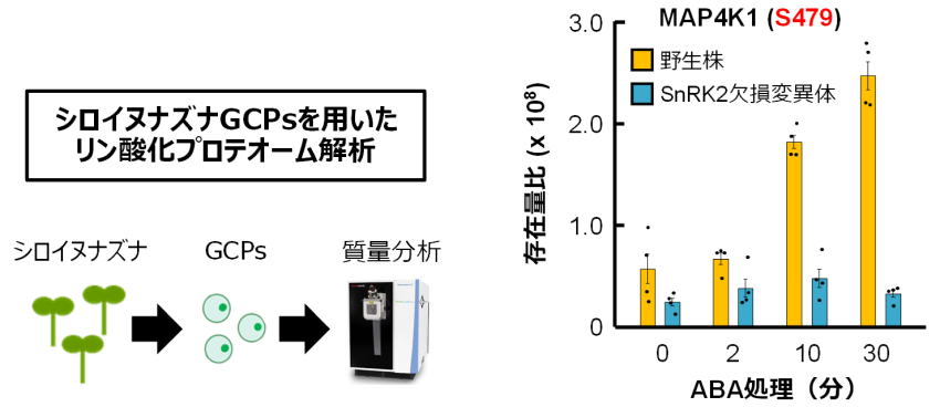 シロイヌナズナから精製した孔辺細胞プロトプラスト(GCPs)を用いたリン酸化プロテオーム解析により、MAP4K1の479番目のセリン(S479)が、ABAおよびSnRK2に依存してリン酸化されることが明らかになりました。