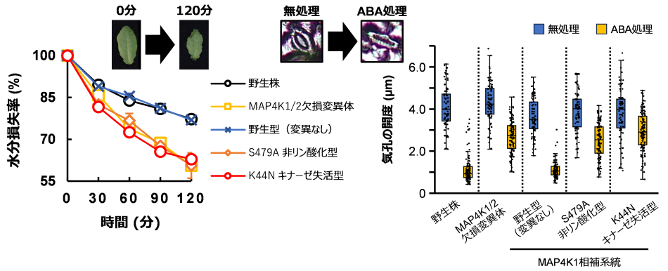 MAP4K1と、それとよく似た働きをもつMAP4K2の両方が欠けた植物では、植物ホルモンABAが働いても気孔をうまく閉じることができません。そのため、葉から水分が多く失われ、植物は萎れやすくなります(図左)。また、この変異体に、働きが不完全なMAP4K1(リン酸化できない型や、酵素として働かない型)を戻しても、気孔を閉じる能力は回復しませんでした(図右)。このことから、MAP4K1が正しくリン酸化され、酵素として機能することが、気孔を閉じて水分を守るために重要であることが分かりました。