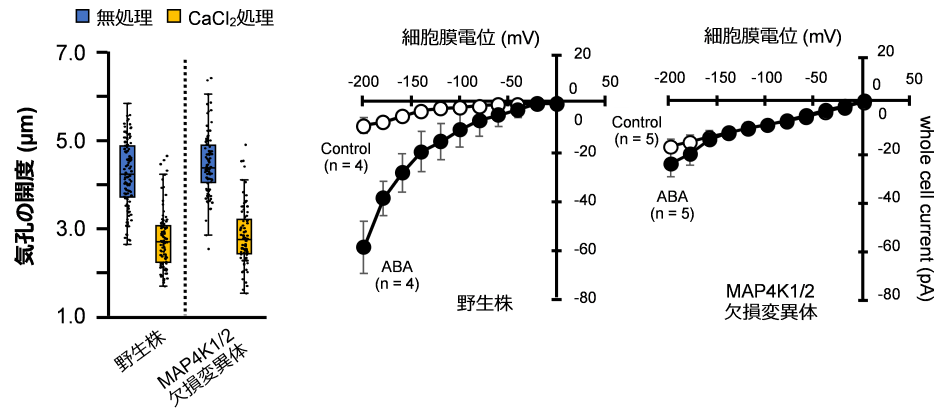 MAP4K1とMAP4K2の両方が欠けた植物では、塩化カルシウム(CaCl₂)を与えて外部からカルシウムを補うと、気孔を閉じる能力が回復し、その程度は野生型の植物とほぼ同じになりました(図左)。また、ABAの刺激によって本来働くはずの細胞膜のカルシウムチャネルがうまく機能せず(図右)、その結果、気孔を閉じる反応が抑制されることが分かりました。このことから、MAP4K1/2は、ABAによるカルシウムの流入を介した気孔閉鎖に重要な役割を果たしていると考えられます。