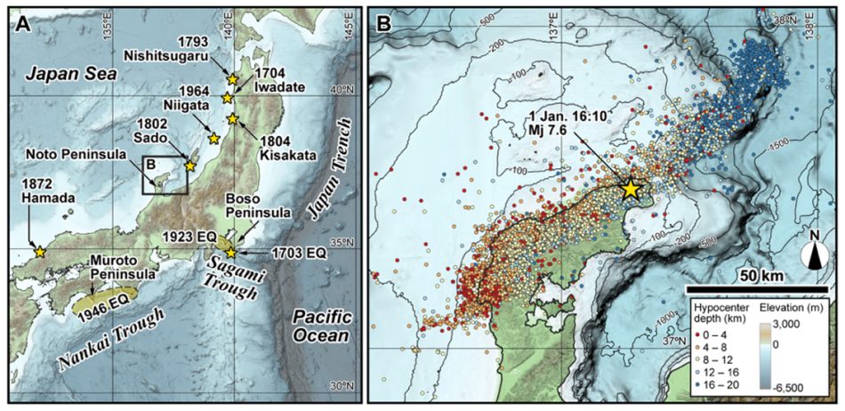 図1.海岸隆起を起こした地震(A)と2024年1月1日能登半島地震と余震(B)