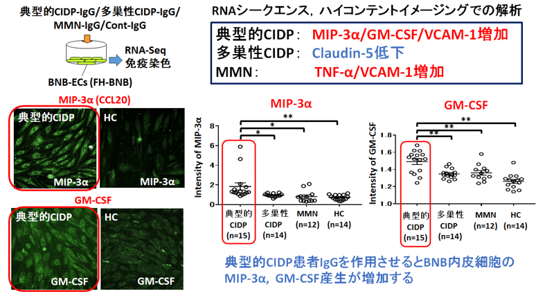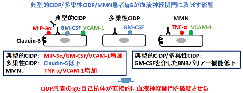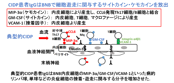 - IgG自己抗体により典型的CIDPではMIP-3α、多巣性運動ニューロパチー(multifocal motor neuropathy: MMN)ではTNF-αとVCAM-1のBNB成内皮細胞の発現が増加し、炎症細胞の末梢神経内侵入を惹起する機序が示唆されました。