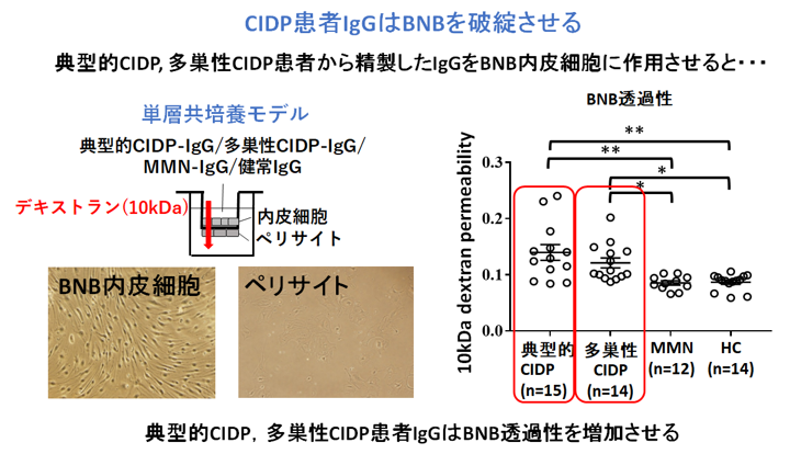 - 典型的CIDPと多巣性CIDPではIgG自己抗体によりBNB構成内皮細胞から放出されるGM-CSFがBNBのバリアー機能を弱めていることを明らかにしました。